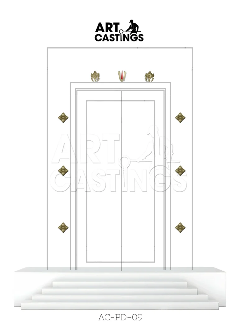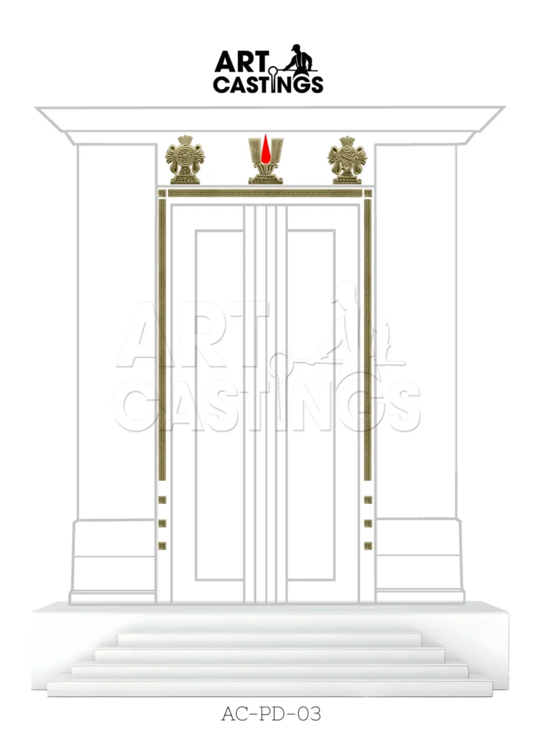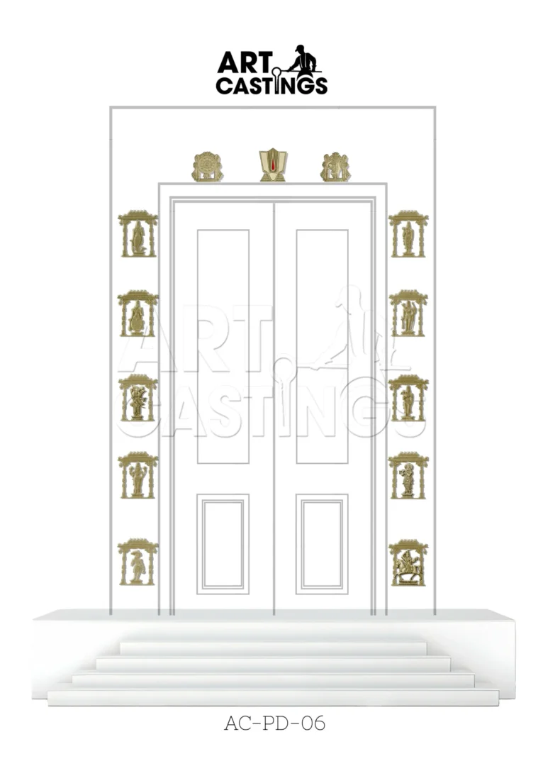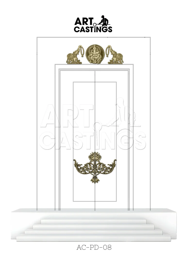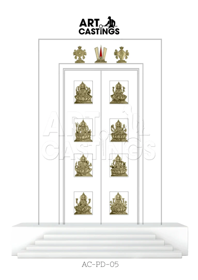 A Lotus-themed Pooja door crafted with brass metal in an antique finish sounds absolutely stunning! The incorporation of Lakshmi Devi and elephant designs adds a touch of traditional and auspicious symbolism to the door. The lotus, often associated with purity, beauty, and spirituality in Hindu culture, would make a perfect motif for a lotus themed Pooja door, signifying the sacredness of the space beyond it. The brass metal and antique finish lend an elegant and timeless feel to the design, while the intricate detailing of Lakshmi Devi and elephants adds depth and richness to the overall aesthetic.