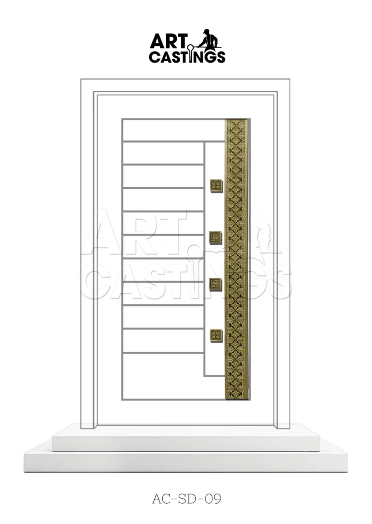A semi-geometrical flower-themed single door design featuring five brass embellishments sounds both elegant and budget-friendly. The incorporation of semi-geometrical flowers adds a touch of nature-inspired beauty to the door, creating a visually appealing focal point for any entryway. Brass embellishments not only add visual interest but also a sense of luxury and sophistication to the design. Overall, this semi-geometrical flower-themed single door strikes a balance between beauty and affordability, making it an excellent choice for those seeking a stylish and budget-friendly door option.